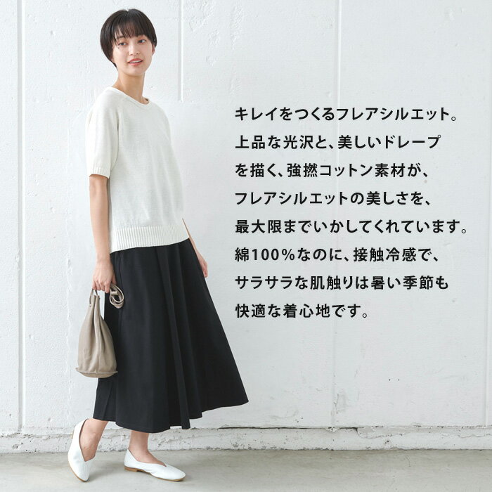 上品な光沢と、美しいドレープを描く、強撚コットン素材が、フレアシルエットの美しさを、最大限までいかしてくれています。